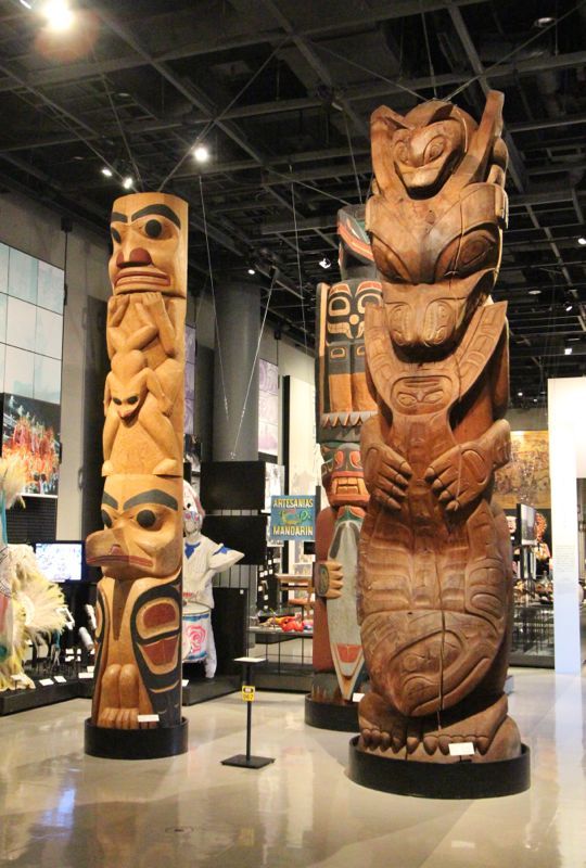 これは、北アメリカの北西海岸先住民が巨木をつかってつくった木柱であり、祖先の功績をたたえる記念柱、死者を安置する墓柱、家の前に立てる入口柱、家のなかの家柱などです。