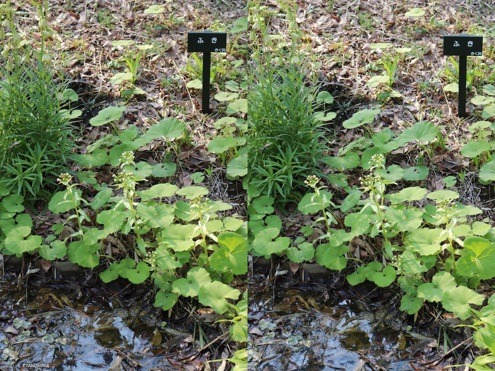 山では沢や斜面、河川の中洲や川岸、林の際などで多く見られますが、乾燥した都心ではたいへん少なくなりました。花のさく前の状態を蕗の薹(ふきのとう)といいます。早春の山菜です。(平行法で立体視ができます)
