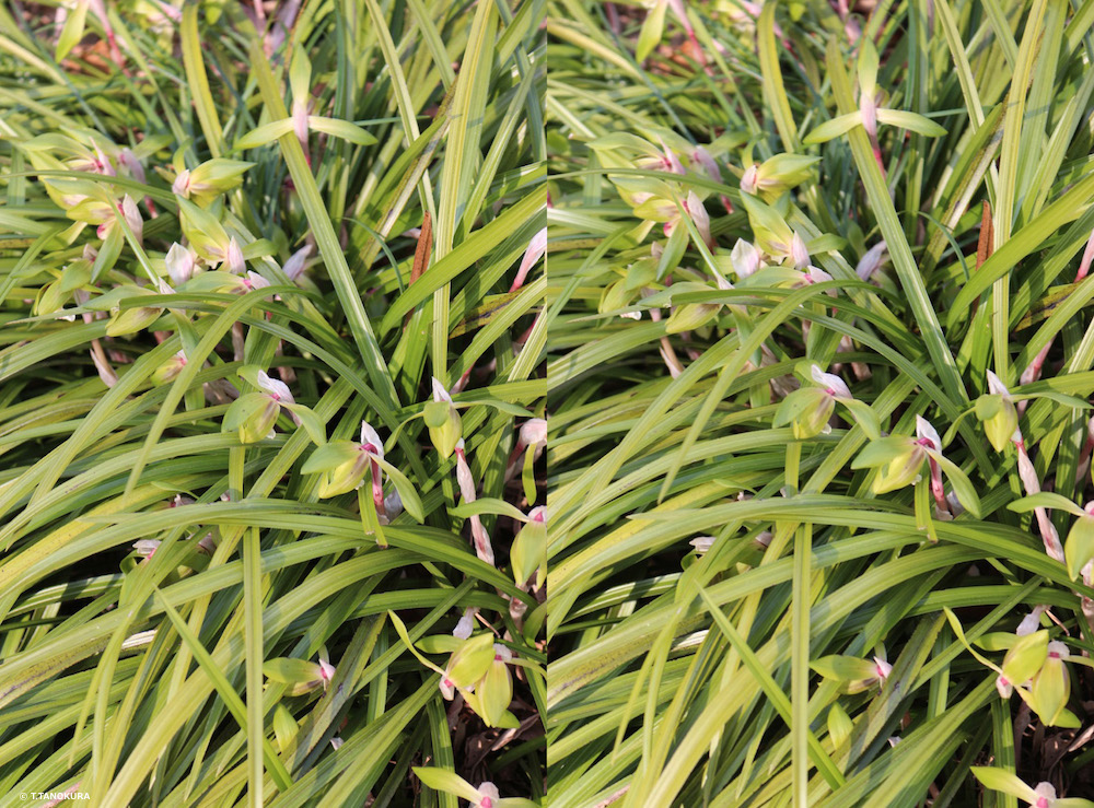 春蘭と書き、ほかのランに先がげて開花します。土壌中に根をひろげる地生蘭の代表的なものです。葉は地表からでる根出葉で細長く、根元からたち上がり曲線をえがいて下に向かっています。