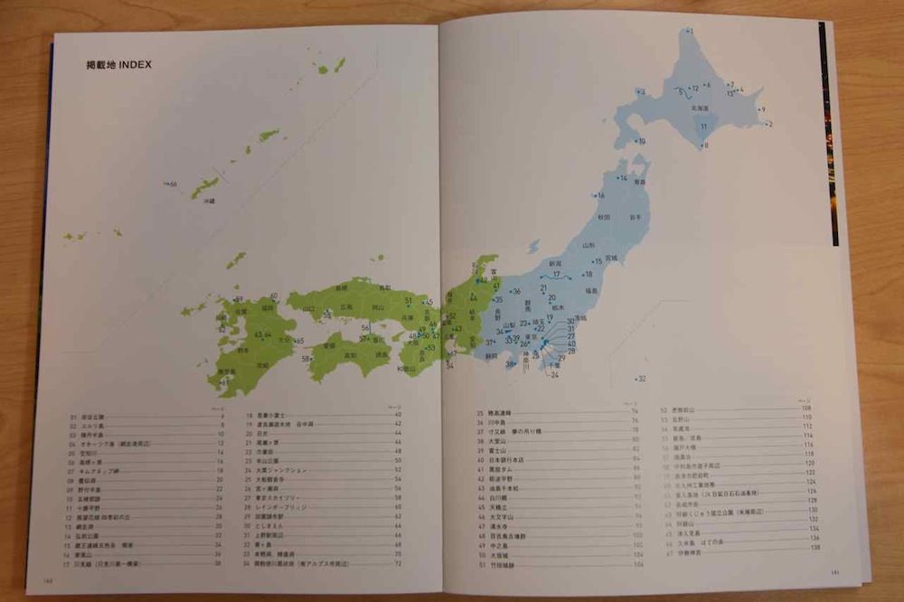2. 140-141ページに、掲載地インデックスとして日本地図と掲載リストがのっています(下の写真)。今度は、このインデクスだけを見て(本書中の写真は見ないで)、それぞれの写真(イメージ)を 01番から順番におもいだします。どこまで正確に想起できるでしょうか。
