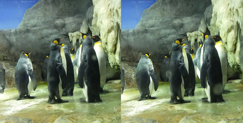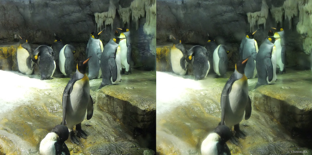 写真はいずれも、大阪市にある海遊館(注2)の「南極大陸」展示で撮影しました。交差法で立体視ができます。