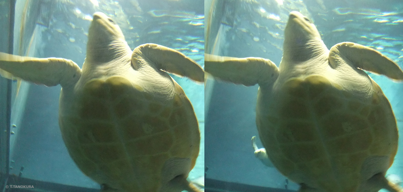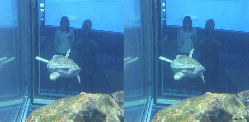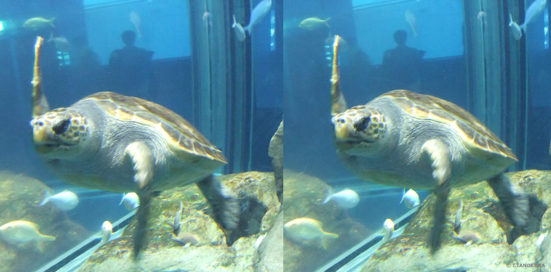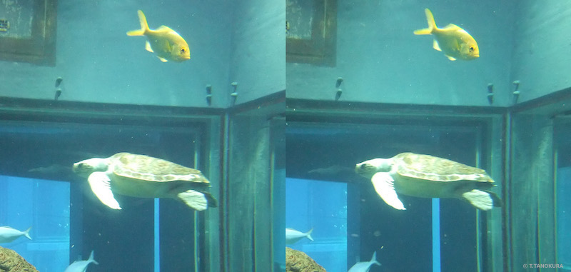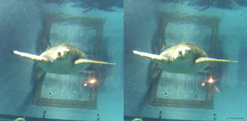 写真はいずれも交差法で立体視ができます。海遊館(注1)の「クック海峡」水槽で撮影しました。カメはいずれもアカウミガメです。