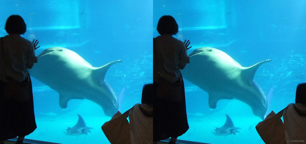 写真はいずれもジンベイザメです。大阪市港区天保山にある海遊館(注2)で撮影しました。平行法あるいは交差法で立体視ができます。