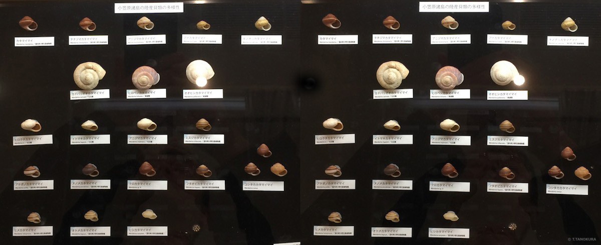 オガサワラコウモリは、日本館2階南翼の常設展「小笠原諸島の生き物」に展示されています。常設展示もあわせてみると生物多様性について理解できます。多様な種類に分化した陸生貝類