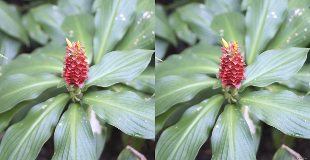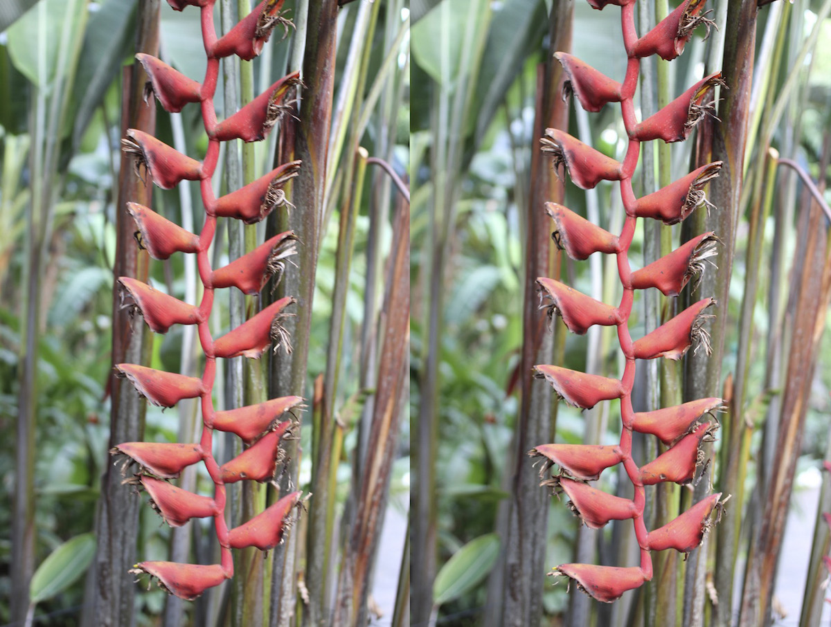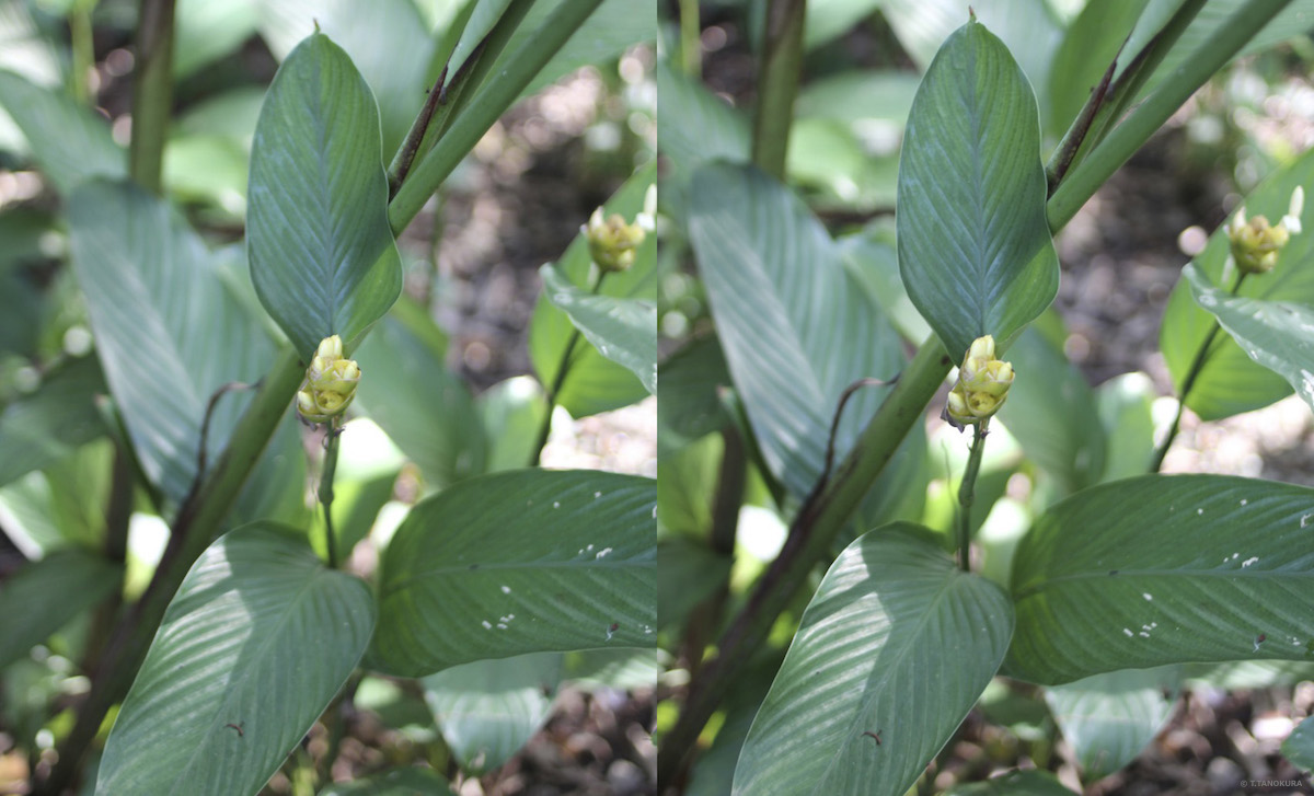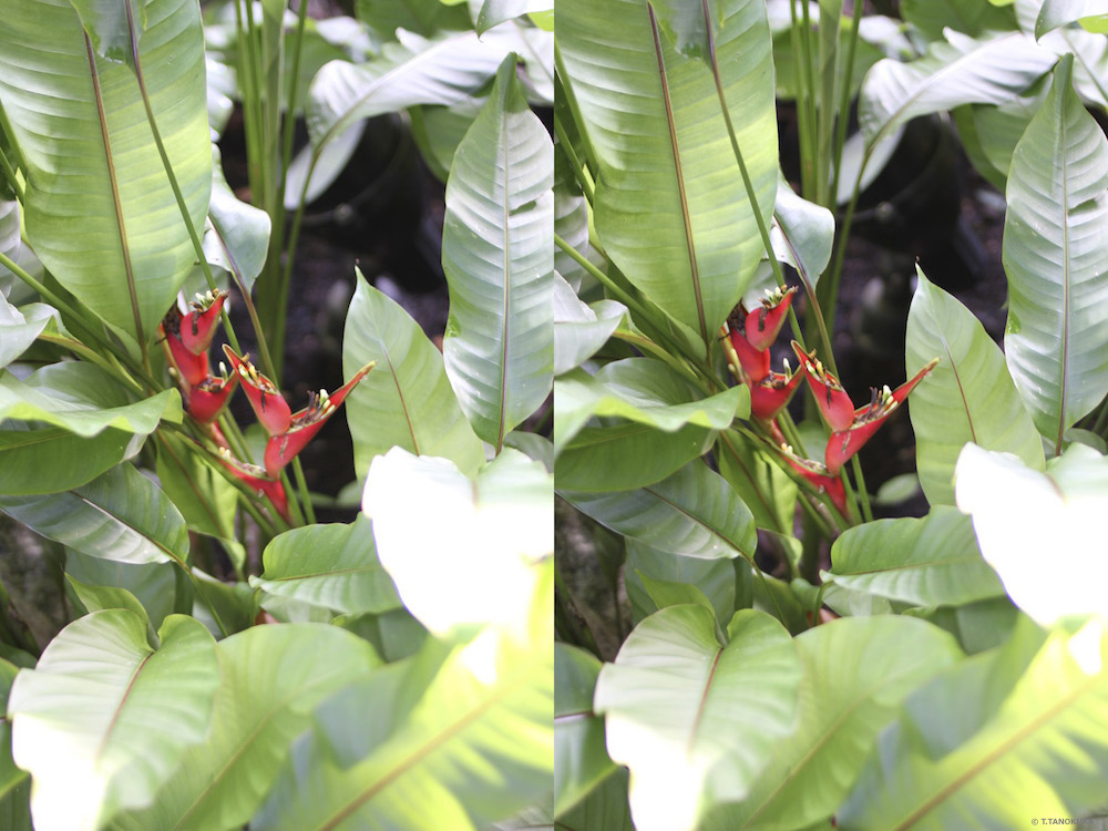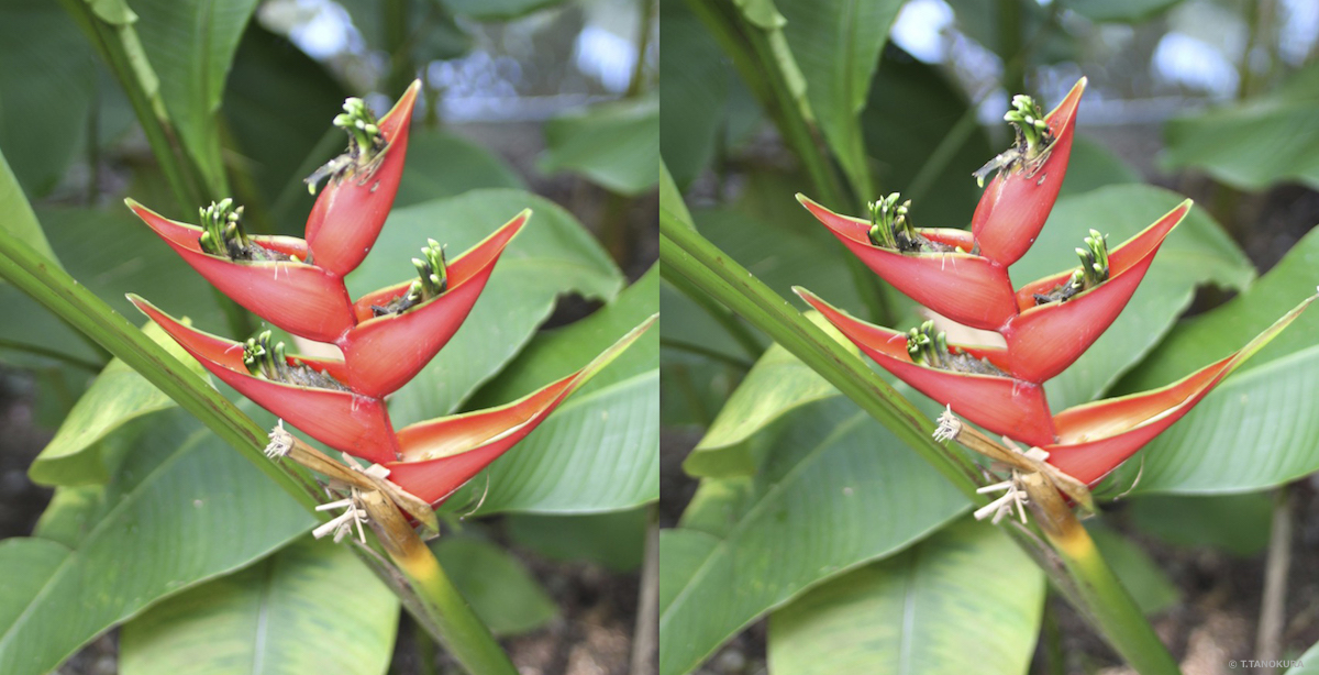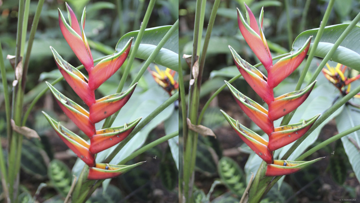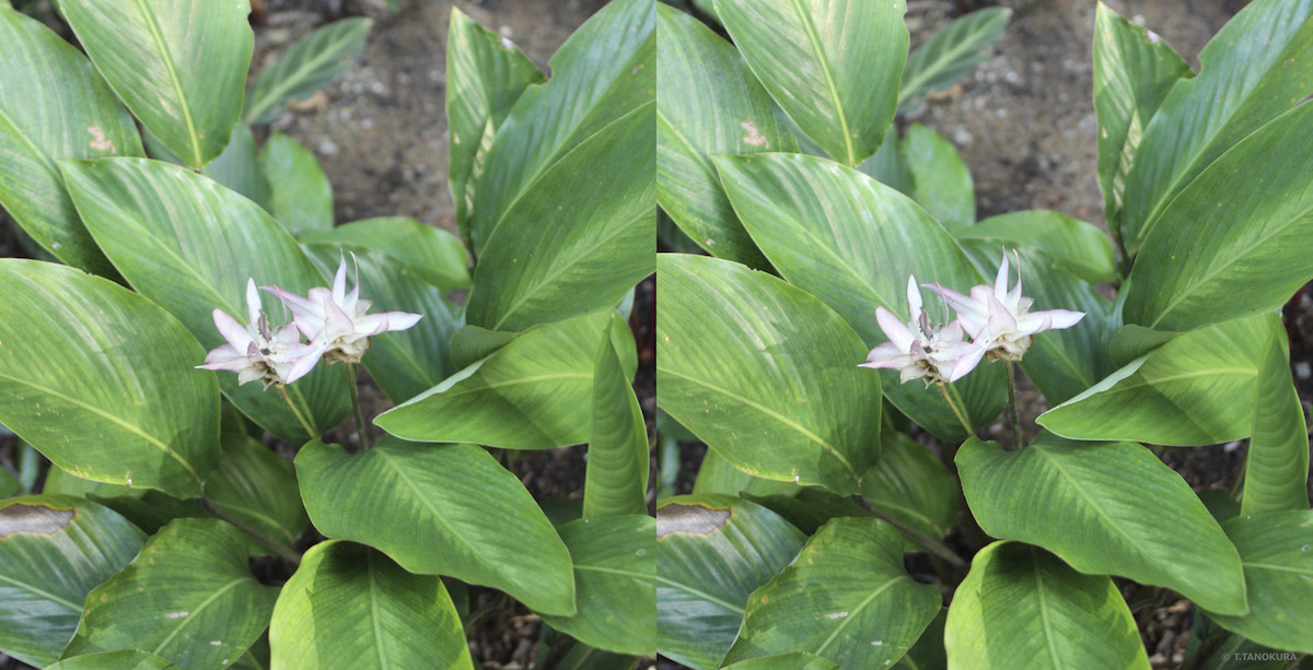 写真はいずれも交差法で立体視ができます。 シンガポール植物園の「ショウガ園」(Ginger Garden)で撮影しました(注1)。