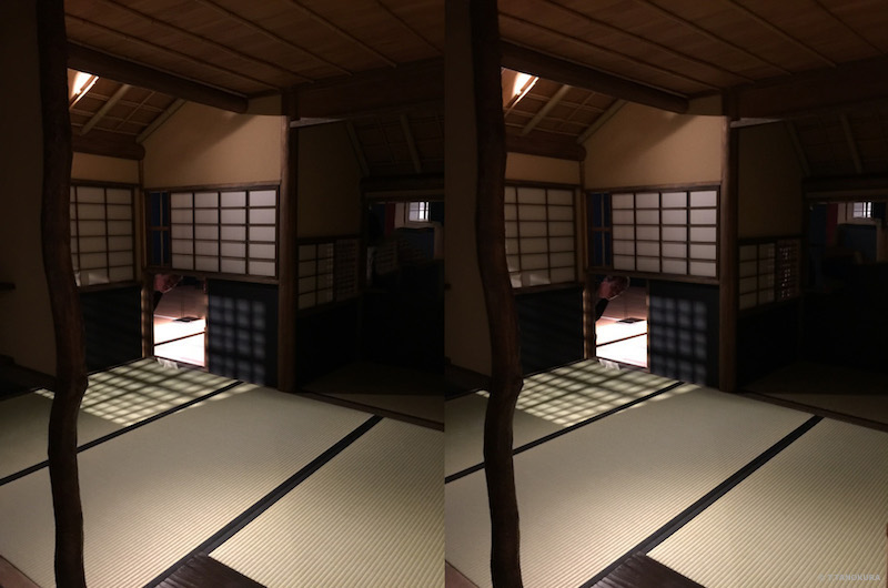 会場内には、京都・藪内家で継承されている古田織部の茶室「燕庵」の再現展示があり、ここだけは写真撮影が許可されていました。千利休とは対照的な、織部独自の工夫がなされた茶室です。平行法で立体視ができます。