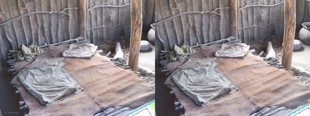 ゴリーダのいちばん奥にはベッドがおかれています。30センチメートルから1メートルくらいの高さに木を組み、その上にウシの皮がしかれています。住居の外側にはサバンナ(自然環境)がひろがっている