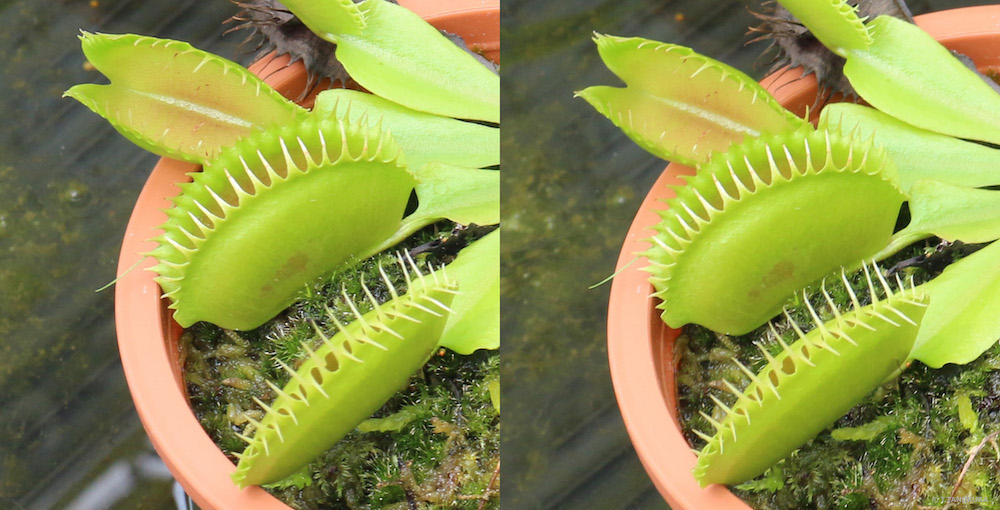 葉が、二枚貝のように2つにわかれていて、このなかに虫がはいって表面にある感覚毛にさわると、葉が急にとじて虫をおしころし、葉から分泌される消化液でゆっくりと虫を溶かして養分を吸収します。わな式の捕虫方法です。米国・東海岸、ノース・カロライナ州とその周辺だけに自生しています。
