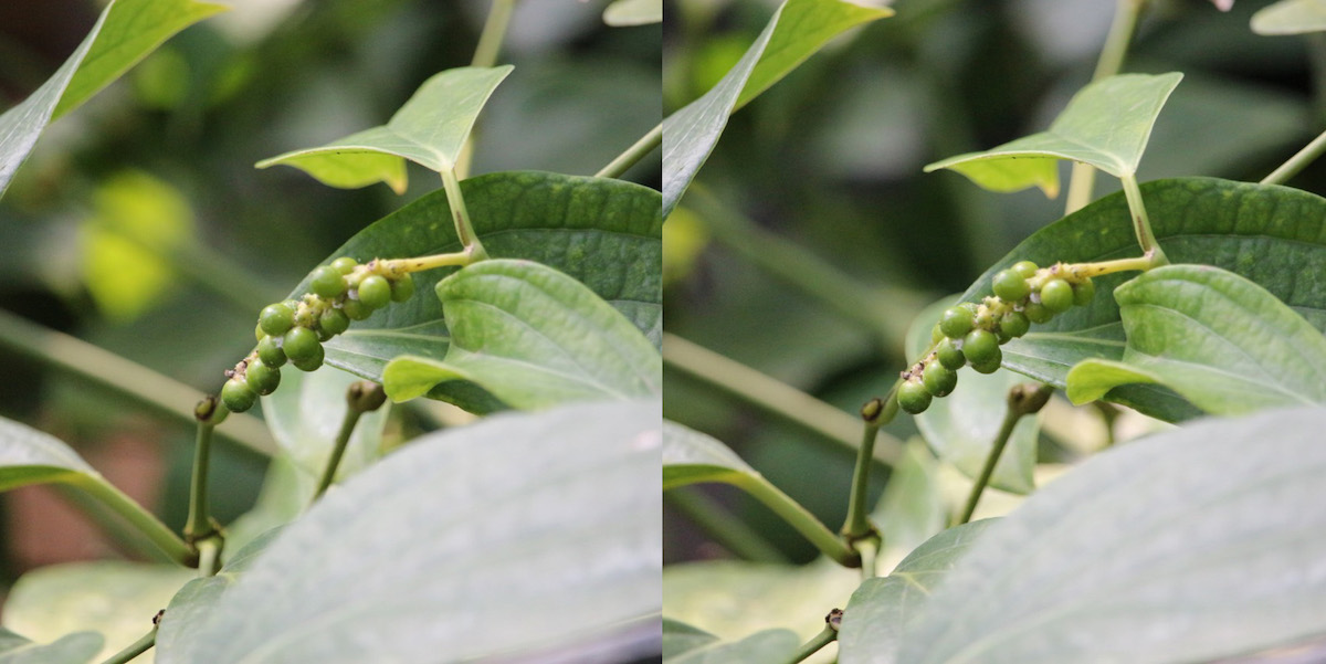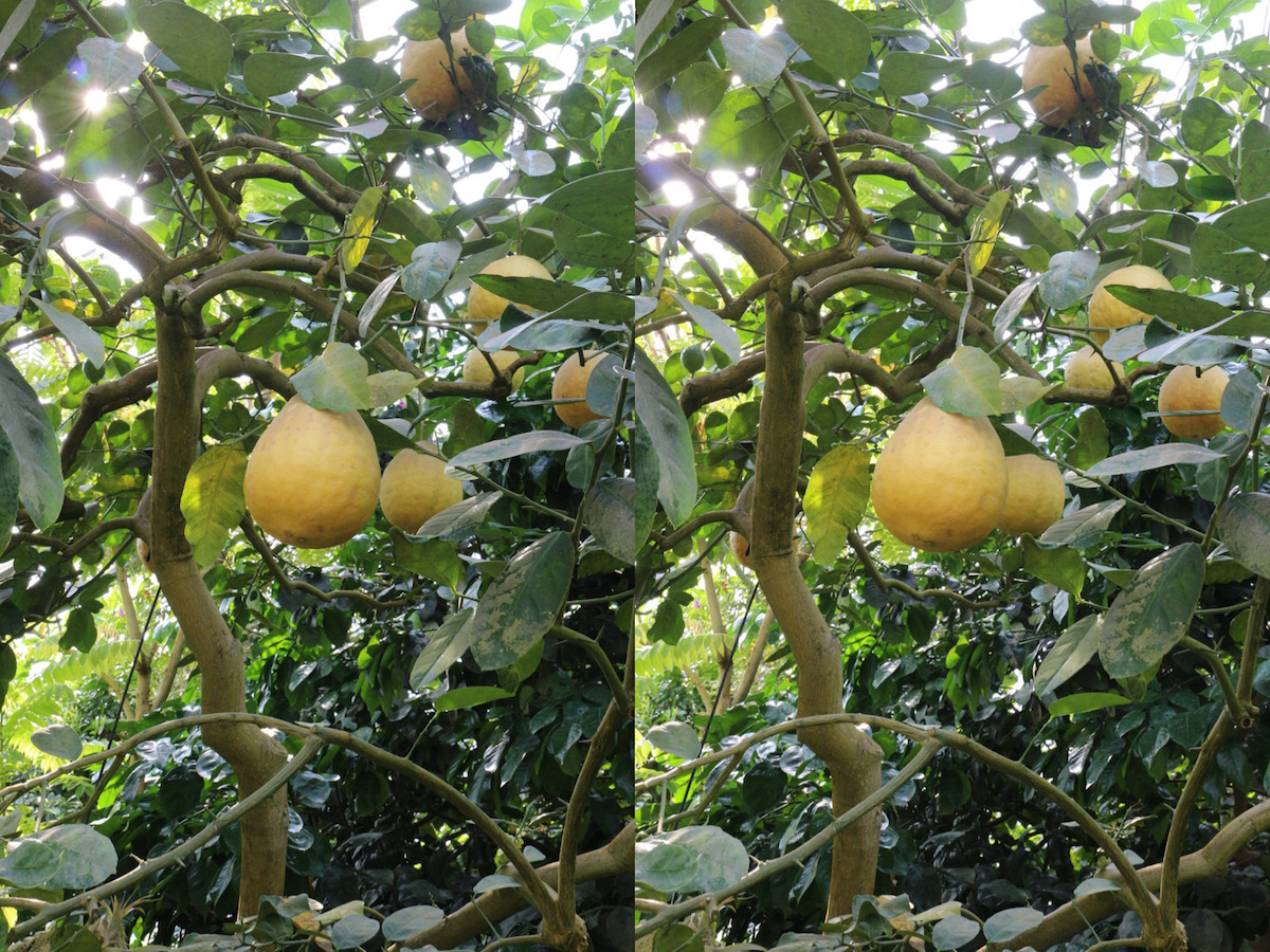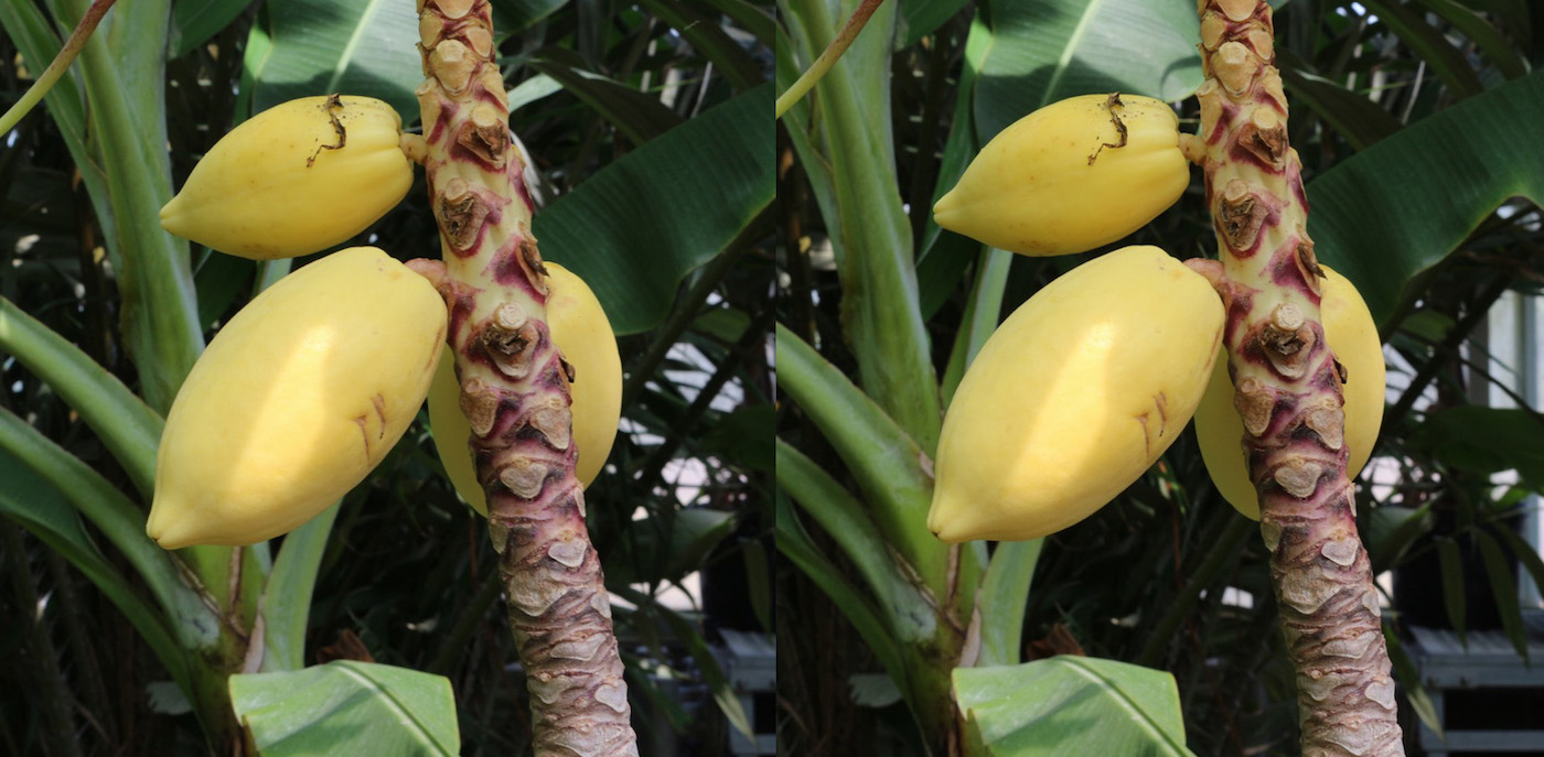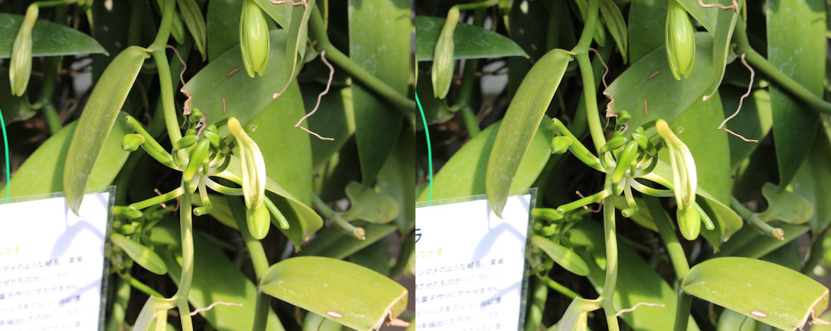 茨城県つくば市にある国立科学博物館・筑波実験植物園の温室ではさまざまな熱帯植物をみることができます(注)。写真は、熱帯資源植物温室で撮影しました。交差法で立体視ができます。