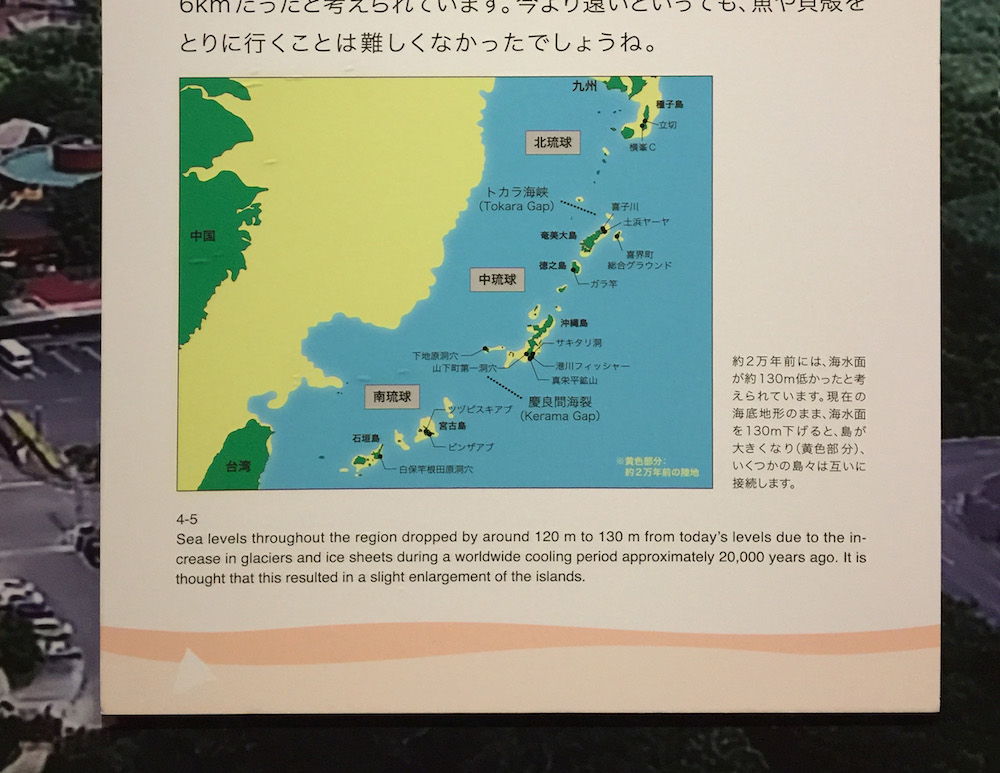 また気候変動による海水面の上下も考慮しておかなければなりません。3〜4万年前は氷期であり、海水面は今よりも約 80 メートル低かったことがしられています。氷期には、氷河や氷床が陸地に生じるため海水がへり、海水面がさがります。しかし琉球列島の周囲は水深がふかいので、それでも大陸と地続きになることはありませんでした。また今から約2万年前にはもっと寒くなり、海水面は今よりも約 120〜130 m 低くなりましたが、それでも大陸と地続きにはなりませんでした(下図)。