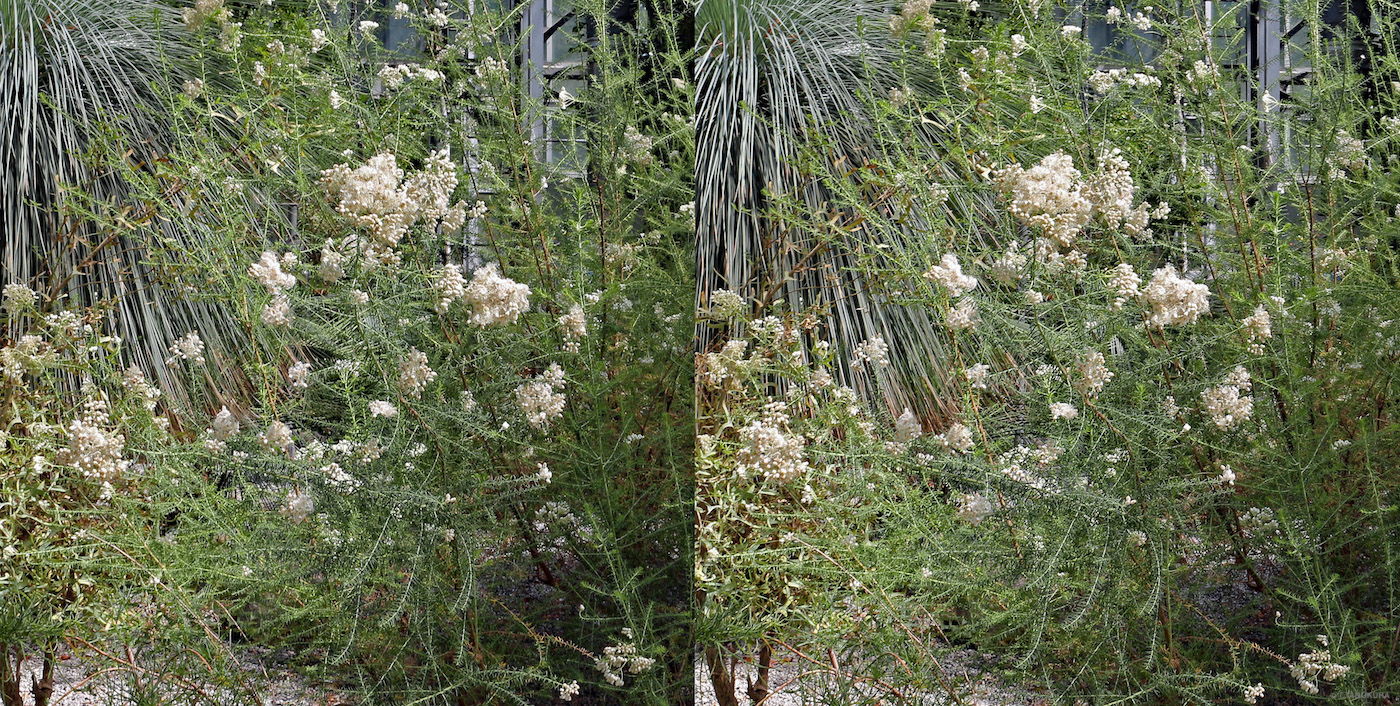 筑波実験植物園の「サバンナ温室」のオーストラリア・エリアではオーストラリア大陸の乾燥地の植物をみることができます。ステレオ写真はいずれも平行法で立体視ができます。