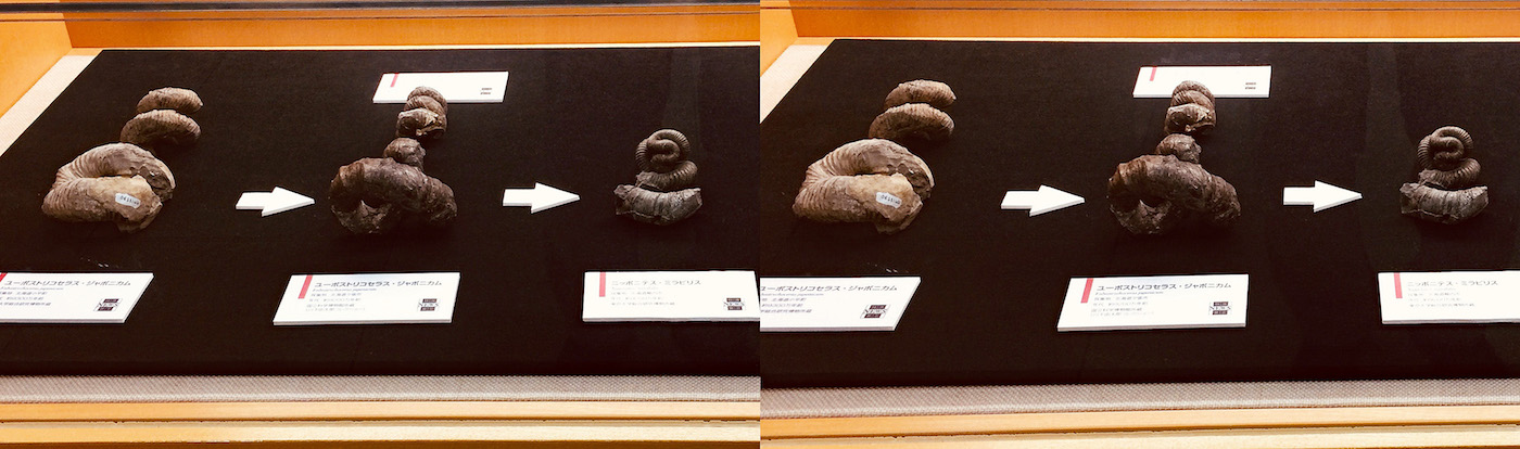 ニッポニテス展(ミニ展示)が国立科学博物館で開催されています(注1)。ステレオ写真はいずれも交差法で立体視ができます。