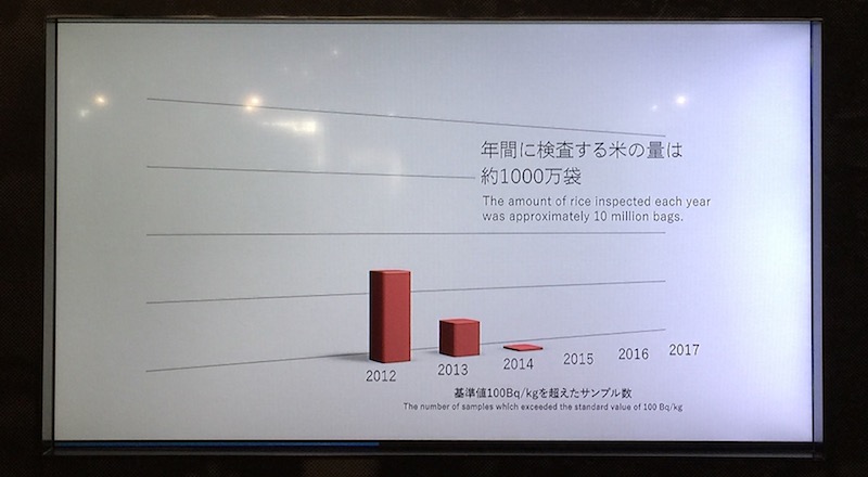 年間に検査する米の量は約1000万袋であり、現在は、基準値 100Bq/kg をこえたサンプルはなくなっています。