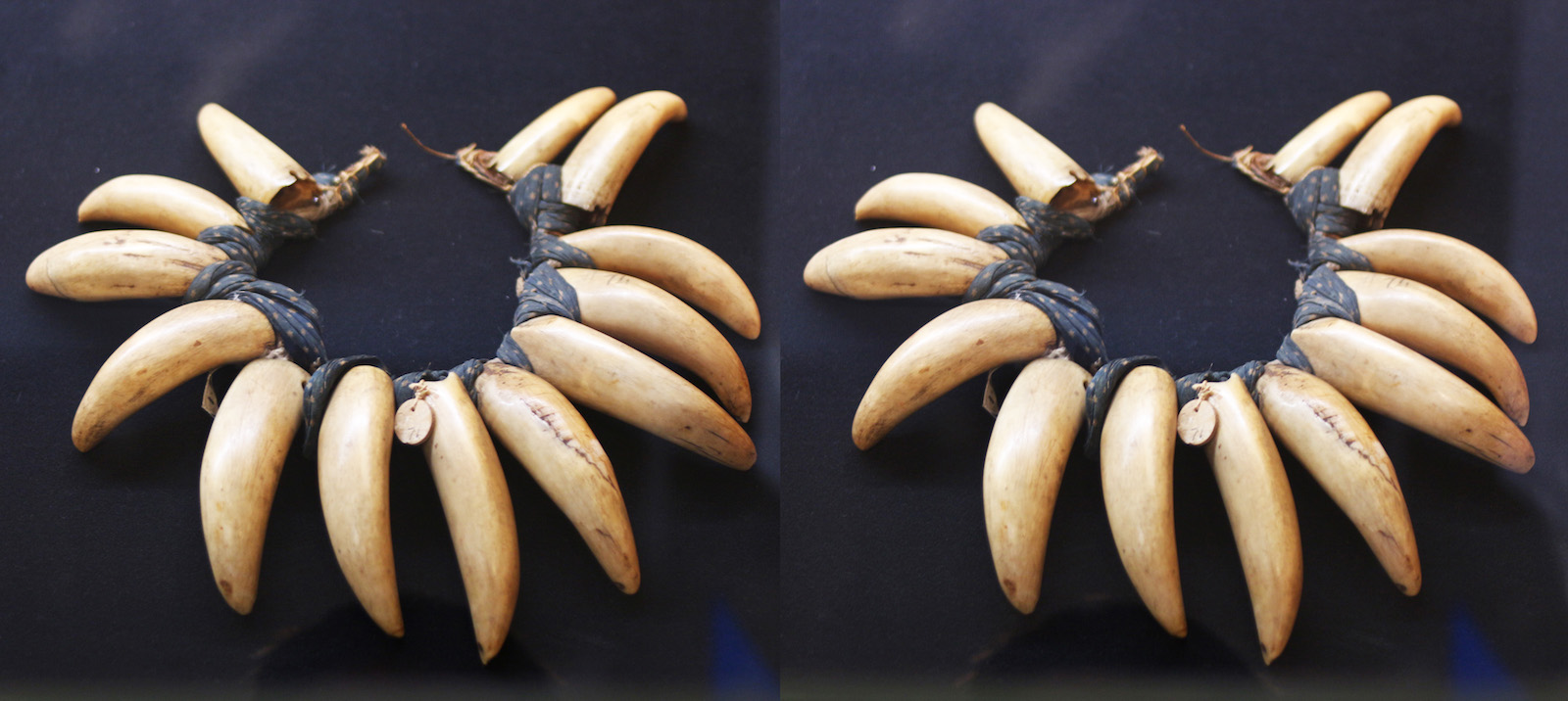 動物は、肉はたべて、のこった部分の骨や爪や羽毛などを装飾品として加工し、動物資源を無駄なく利用しました。歯や骨や貝殻などは、狩猟や漁労・採集といった生業活動によってえられる素材であり、それらからつくられるビーズをみることによって狩猟文化や海洋文化を想像することができます。