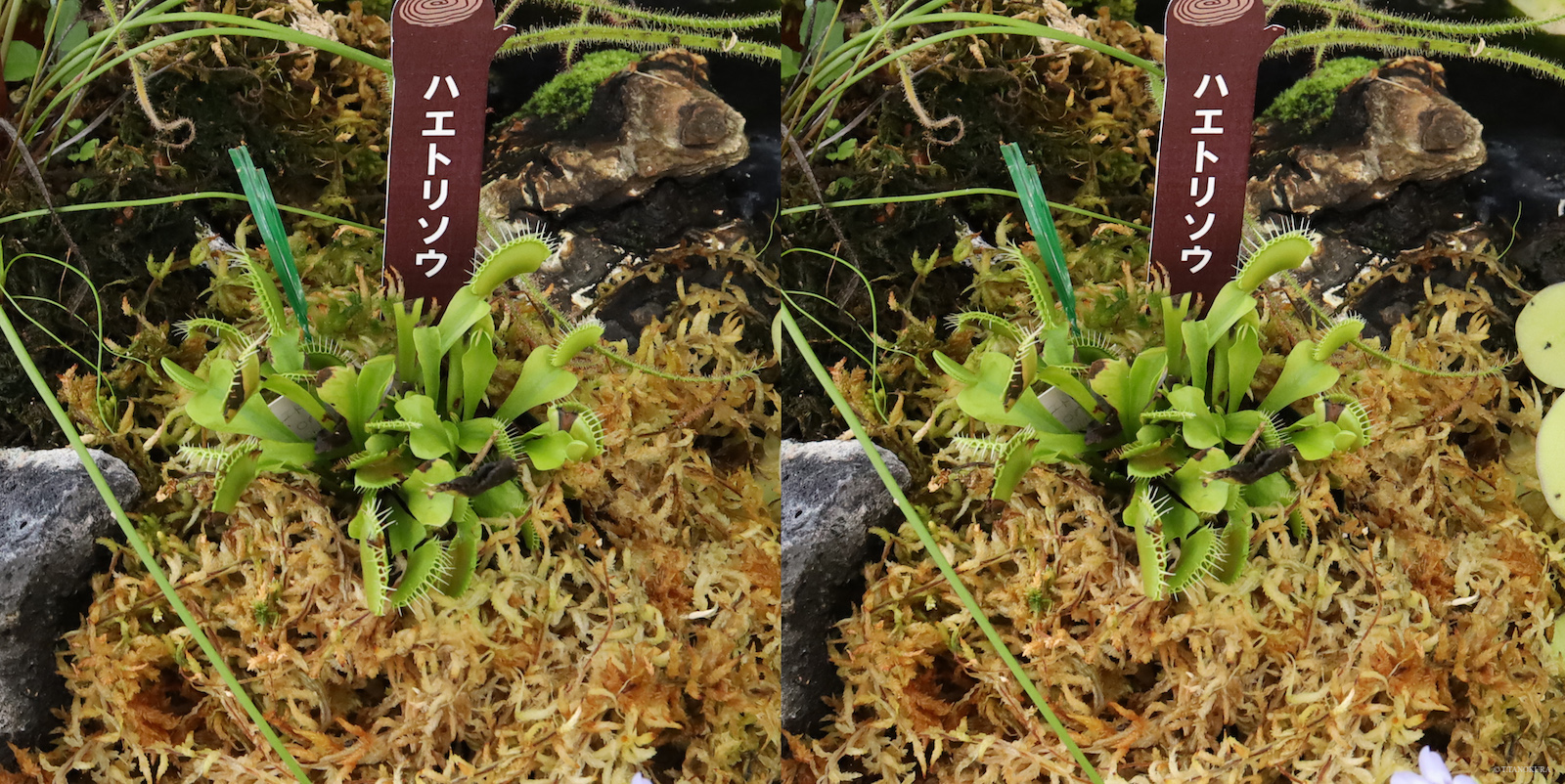 ハエトリソウは、二枚貝のような葉のなかに「感覚毛」というセンサーを3本もち、そこに虫が2回ふれるとパクッとはさみこみます。とじた葉は、1〜2週間かけてゆっくり栄養を吸収します。その後ふたたびひらきますが、この動きによって大量のエネルギーを消費するため、2〜3回開閉をくりかえすと葉はかれてしまいます。