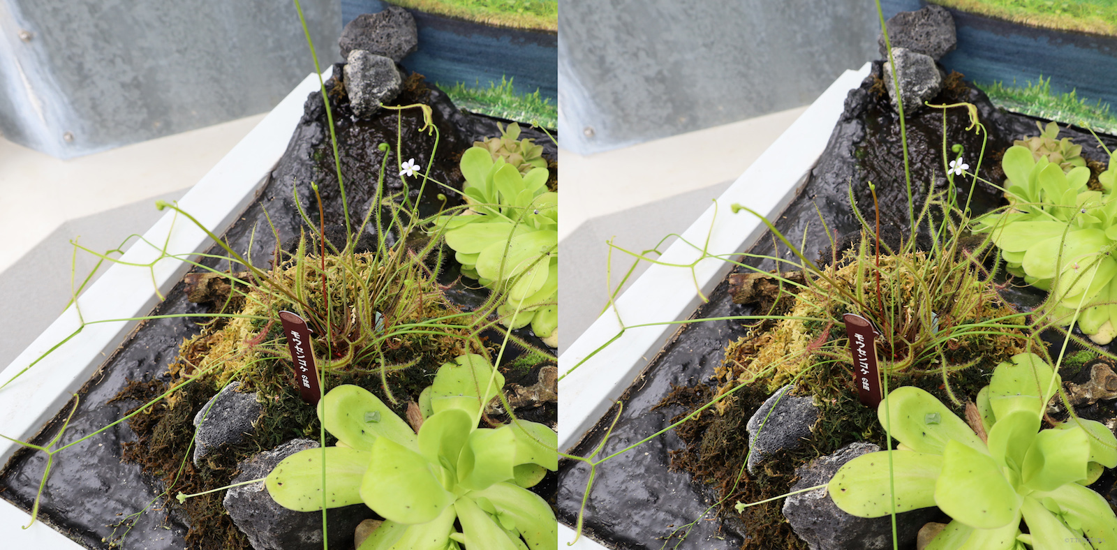 ムジナモは、葉は袋状ではなく、ハエトリソウのような二枚貝に似た形をしており、40本もの感覚毛を内側にもち、そこに虫が一度ふれると、1/50という植物界最速で虫をとじこめます。そして消化酵素をだすと虫は6時間でとけはじめ、24時間で分解し吸収されます。ムジナモは、1890年、植物学者 牧野富太郎によって江戸川の土手にあったちいさな池で発見されました。現在では、天然の自生地はすでになく、埼玉県羽生市宝蔵時沼にのこった自生地で国定天然記念物として保護されながら生息しています。