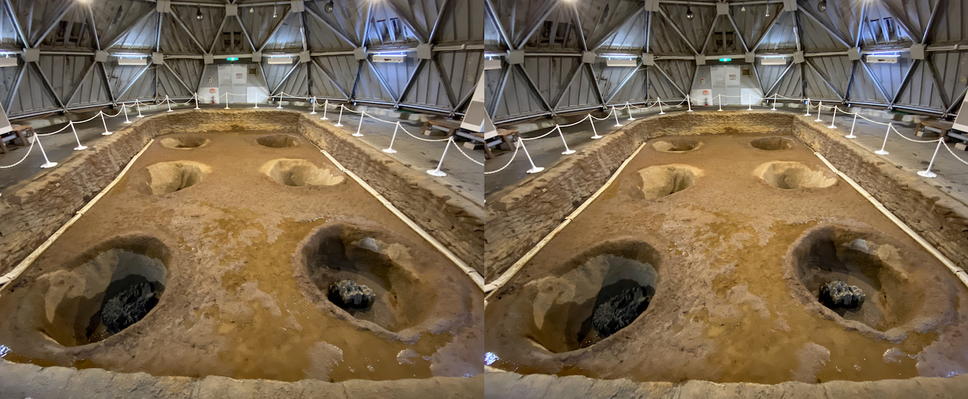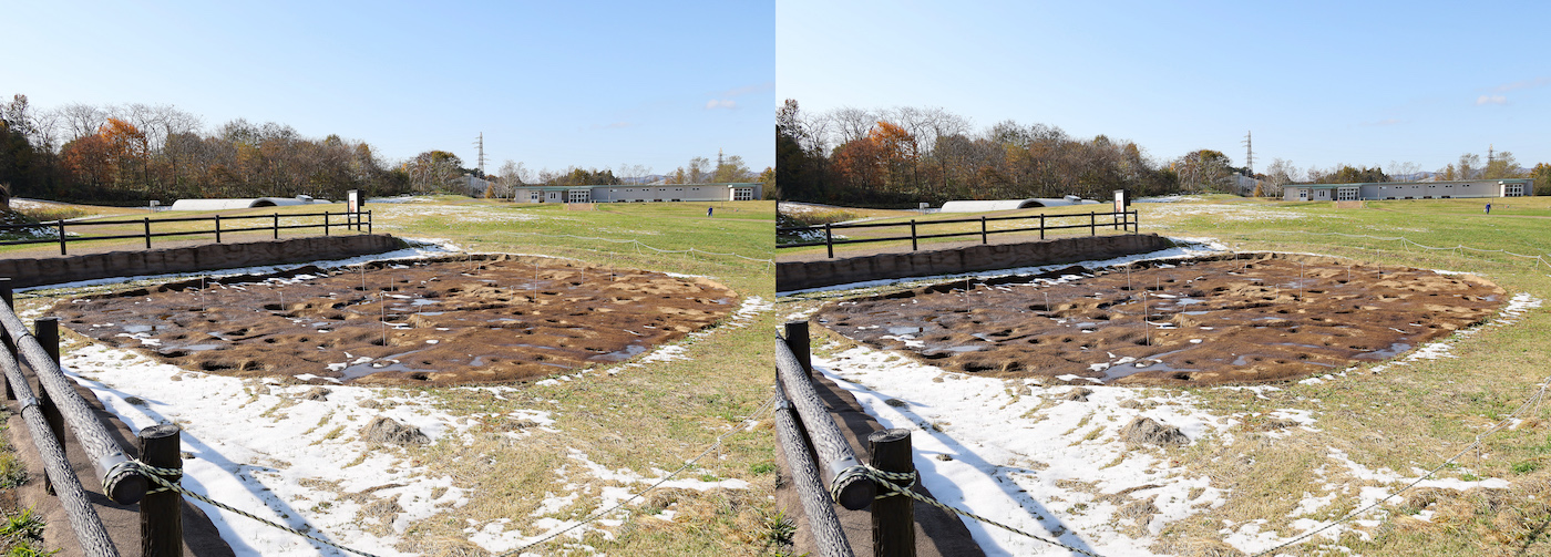 「大型竪穴建物跡」は、集落の中央付近からおおくみつかります。公開している建物跡は縄文時代前期(紀元前約3500年)のものであり、ながさは約15m、柱の位置が外側へ移動していることから建て替えされた可能性が指摘されています。