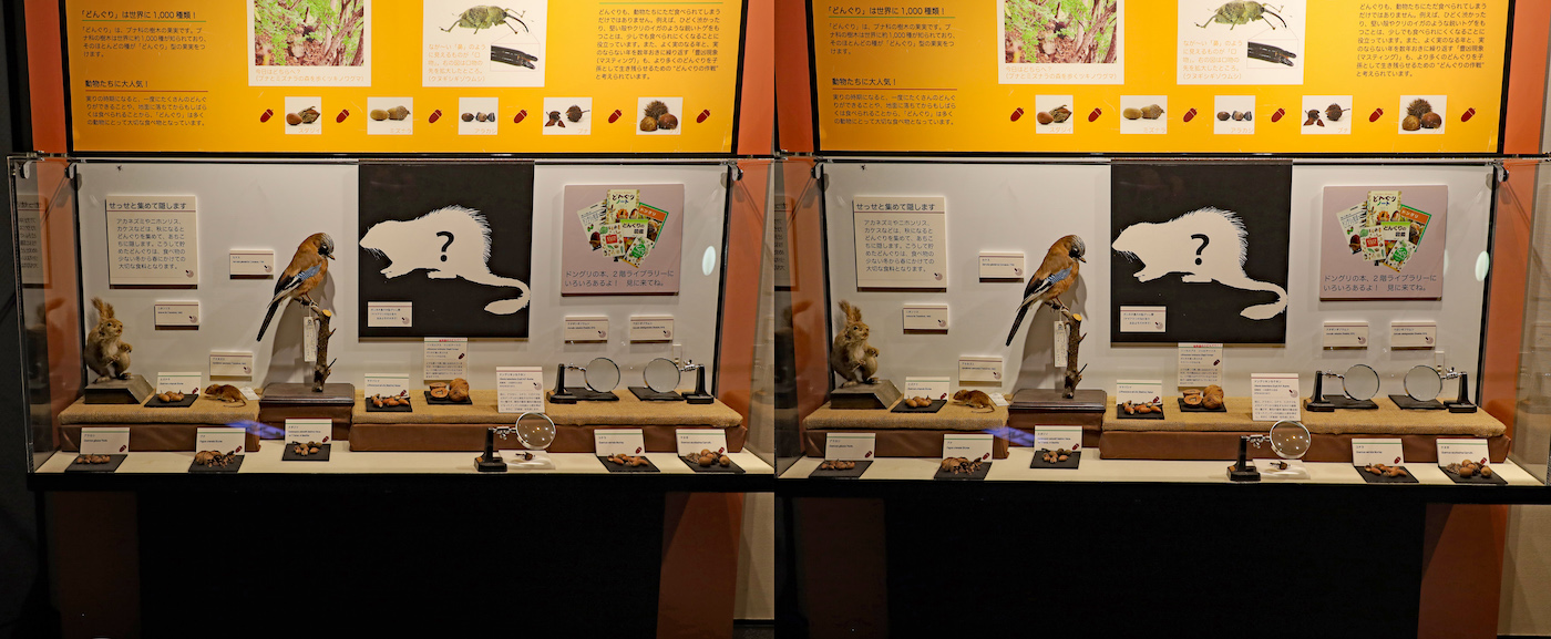 生命の星・地球博物館(注1)の第2展示室「生命を考える」には、「多様性をもたらしたもの」と題して生物をはぐくむ仕組みをさぐるコーナーがあります。ステレオ写真はいずれも平行法で立体視ができます(注2)。