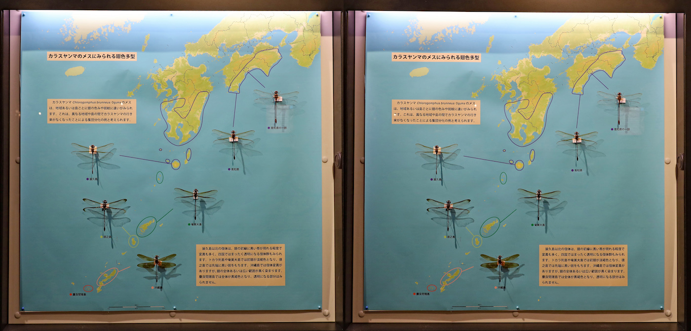 たとえば「カラスヤンマ」のメスは、地域あるいは島ごとに翅の色味や斑紋にちがいがあり、これは、ことなる地域や島のあいだで、カラスヤンマの行き来がなくなったことによる「集団分化」の例であるとかんがえられます。