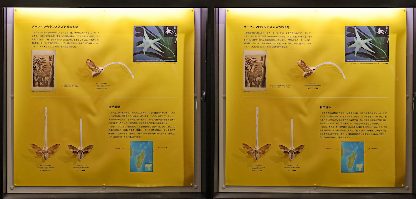 ダーウィンは、マダガスカルのランである「アングレクム・セスキペダレ」の「距」(蜜をためる花の構造)がとてもながいのをみて、ながい口をもつ「蛾」がこの花にくるにちがいないと進化論にもとづいて予想しました。約40年後、ストローのようなとてもながい口をもつ「キサントパンスズメガ」(スズメガ科)がみつかり、ダーウィンの予想が確認されました。マダガスカル島のキサントパンスズメガは、コモロ諸島のそれよりもながい口をもち、これは、アングレクム・セスキペダレがはえているマダガスカル島では、ながい口をもつ個体が生存に有利だったという自然選択の結果だとかんがえられます。