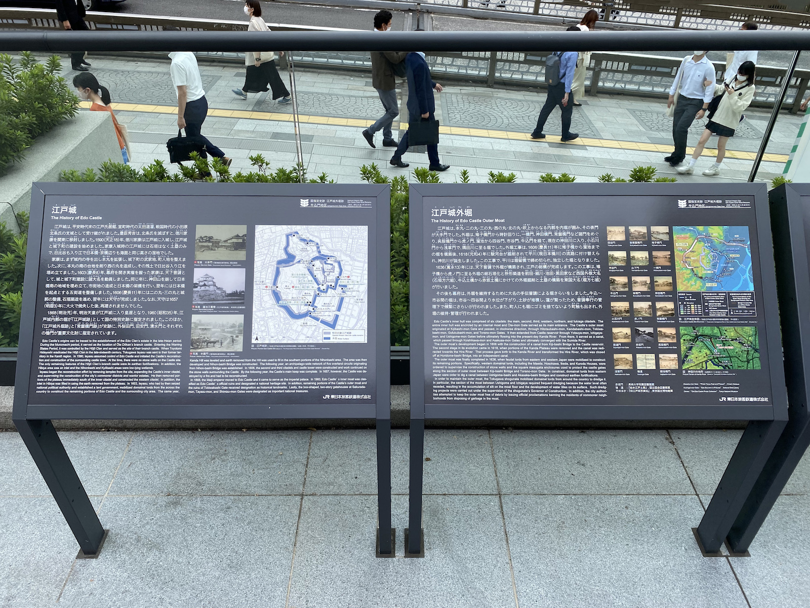 写真1は、現在の飯田橋駅の南口から南西方向をみたものであり、このあたりには外濠がよくのこっています。飯田橋駅南口には、江戸城に関する案内板(写真 2, 3, 4)もありとても参考になります。是非いってみてください。