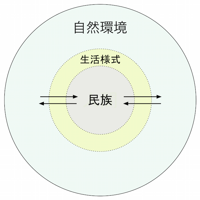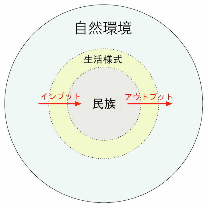 これらは中心に都市があり、その周囲に耕作地(農地)がひろがり、さらにその周辺に山・川・森などの自然環境がひろがっています。これは下図のようにモデル化することできます。都市と自然環境とがつくりだす「主体-環境系」になっています。
